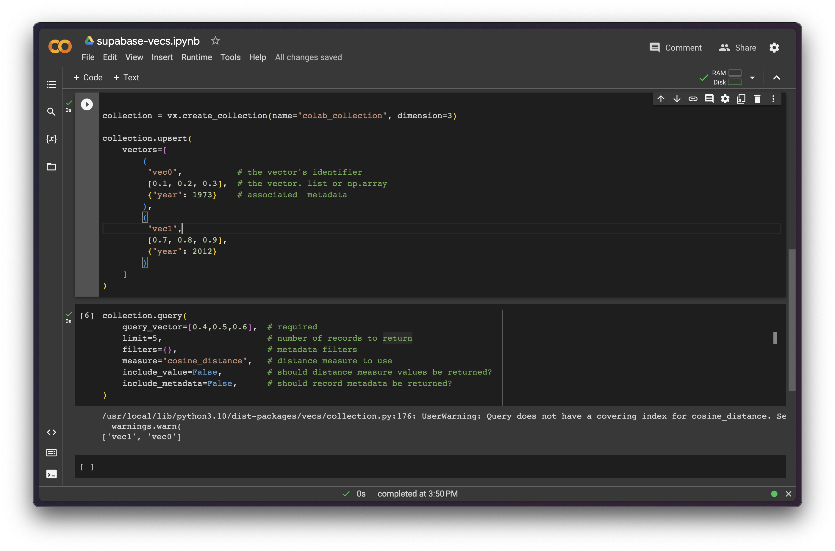 Google Colab is a hosted Jupyter Notebook service. It provides free access to computing resources, including GPUs and TPUs, and is well-suited to machine learning, data science, and education. We can use Colab to manage collections using Supabase Vecs.