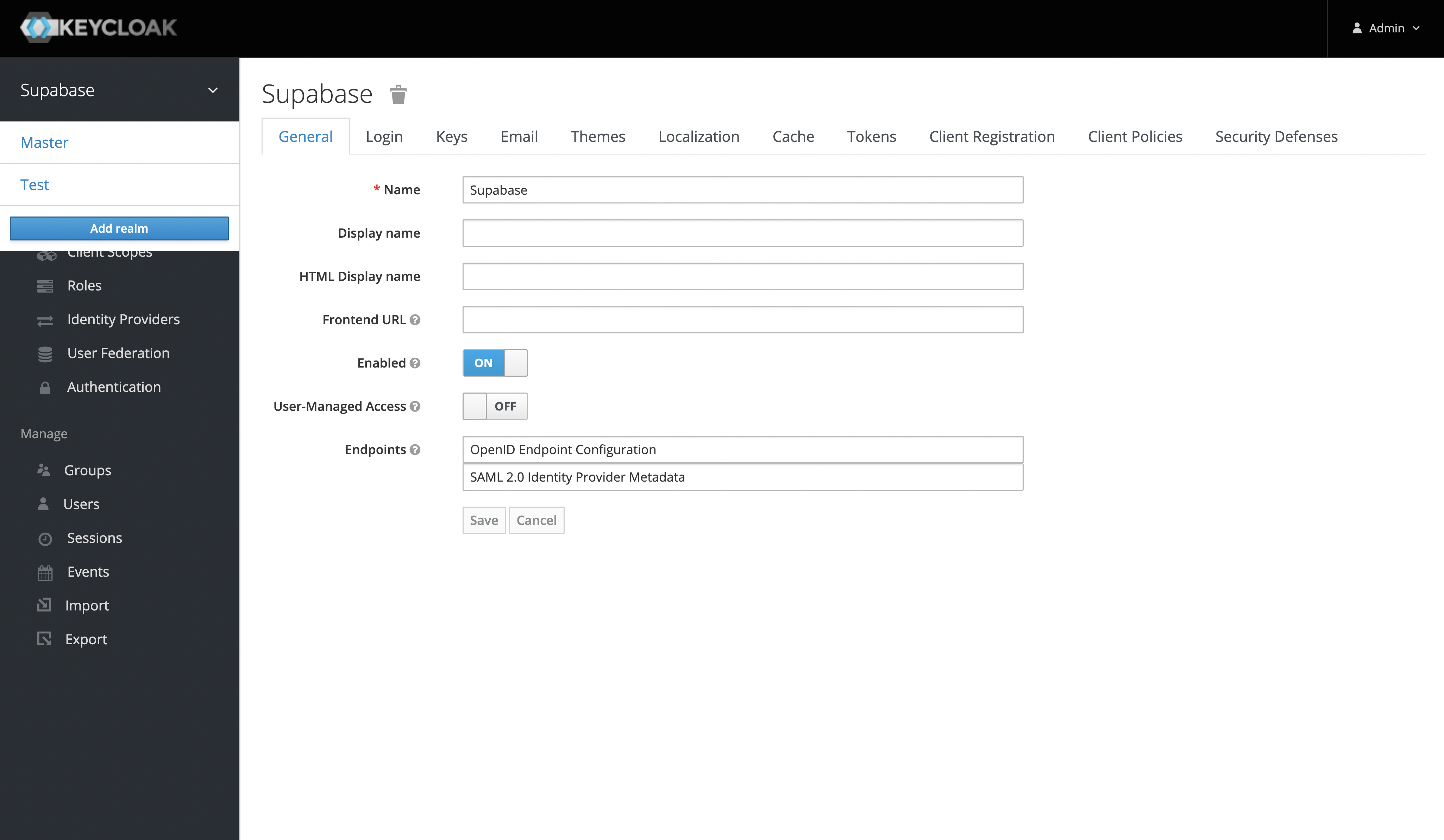 - Once you've logged in to the Keycloak console, you can add a realm from the side panel. The default realm should be named "Master".