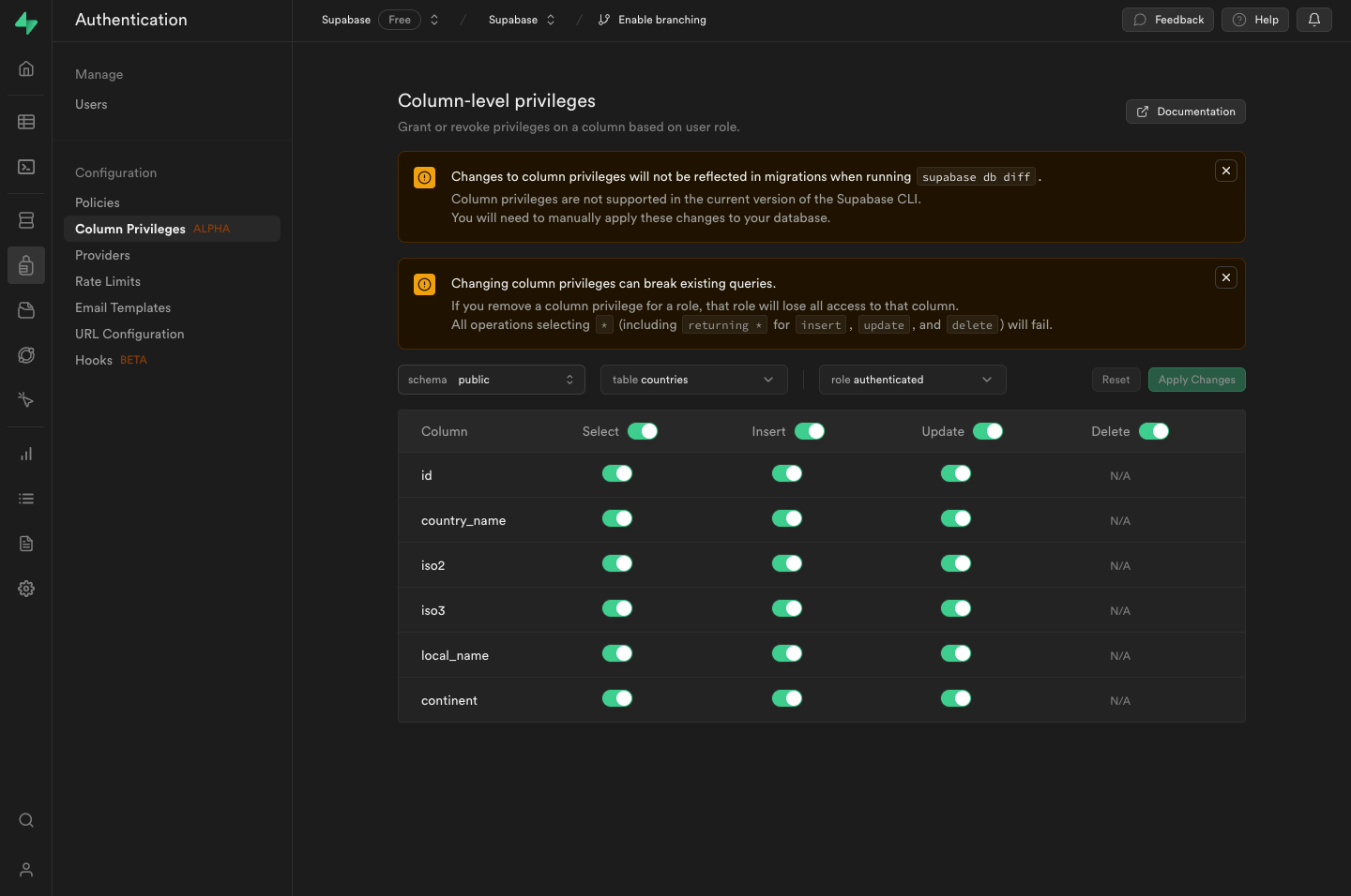 While you can manage privileges directly from the Dashboard, as your project grows you may want to manage them in your migrations. Read about database migrations in the Local Development guide.