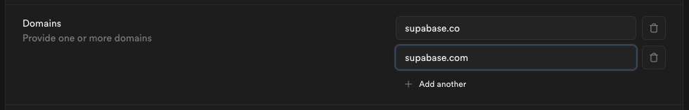 If your organization uses more than one email domain - for example, supabase.com for staff and supabase.io for contractors - you can add multiple domains here. All listed domains will be authorized for SSO sign-in.