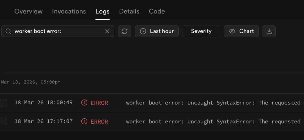 1worker boot error: Uncaught SyntaxError:2The requested module 'jsr:@supabase/functions-js' does not provide an export named 'doesNotExist' at file:///var/tmp/sb-compile-edge-runtime/source/index.ts:2:10”To fix, check the module and its imports to make sure they exist and are supported by Supabase Edge Functions.
