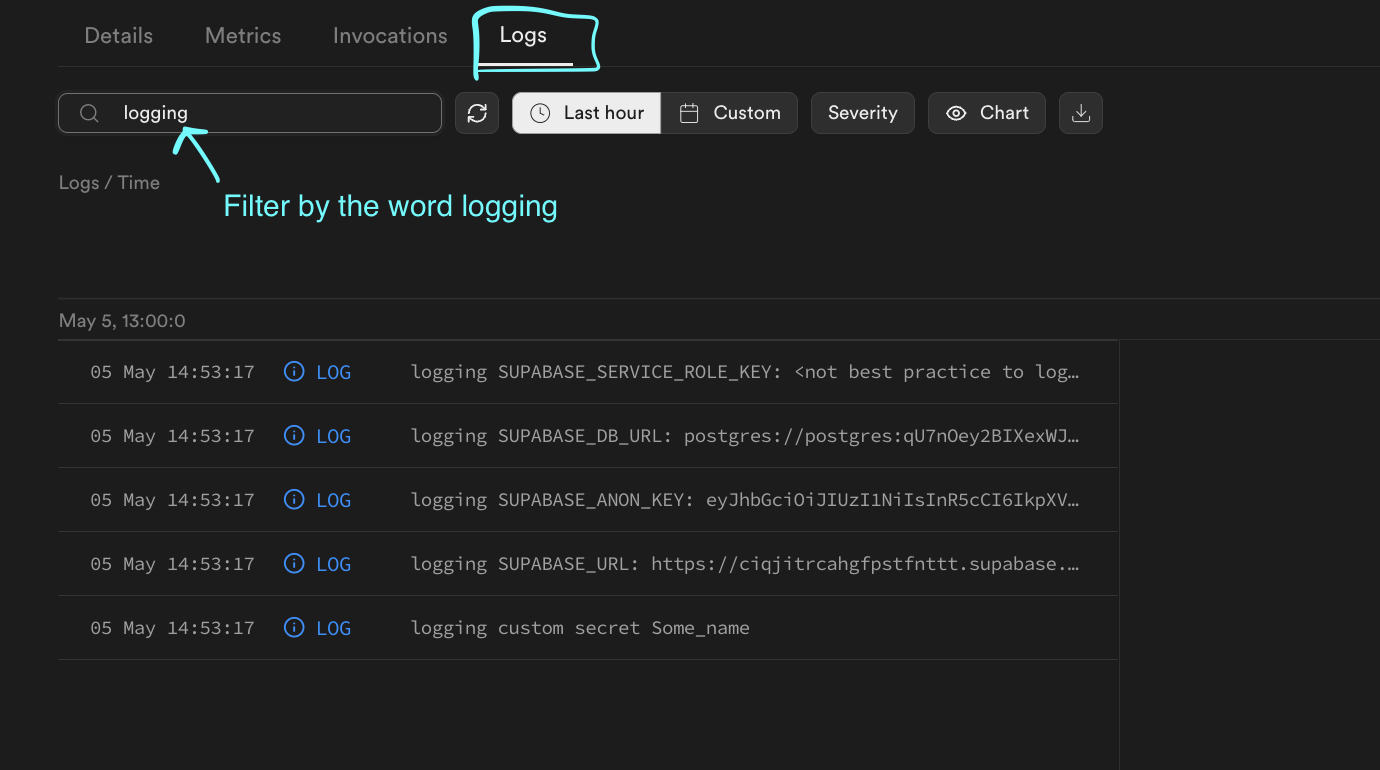 1//logs the function call and the secrets2console.log('Hello from Functions!')34//custom secret5console.log('logging custom secret', Deno.env.get('MY_NAME'))67// default secrets8console.log('logging SUPABASE_URL:', Deno.env.get('SUPABASE_URL').slice(0, 15))910Deno.serve(async (req) => {11 const { name } = await req.json()12 const data = {13 message: `Hello ${name}!`,14 }1516 return new Response(JSON.stringify(data), { headers: { 'Content-Type': 'application/json' } })17})After calling your function, you can check your edge function logs to observe the logged values. It should look something like this:
